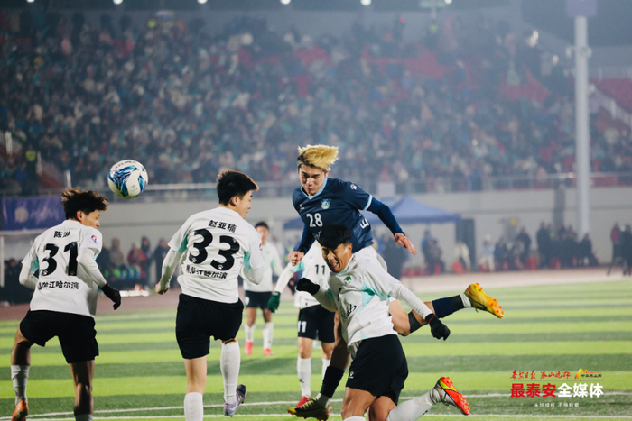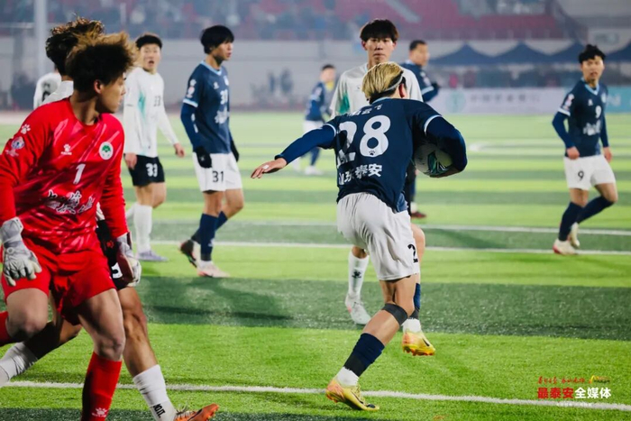 比赛第38分钟,阿力45度送出精准传中,严逸聪门前垫射稍稍偏出球门,泰安队错失扩大领先良机。